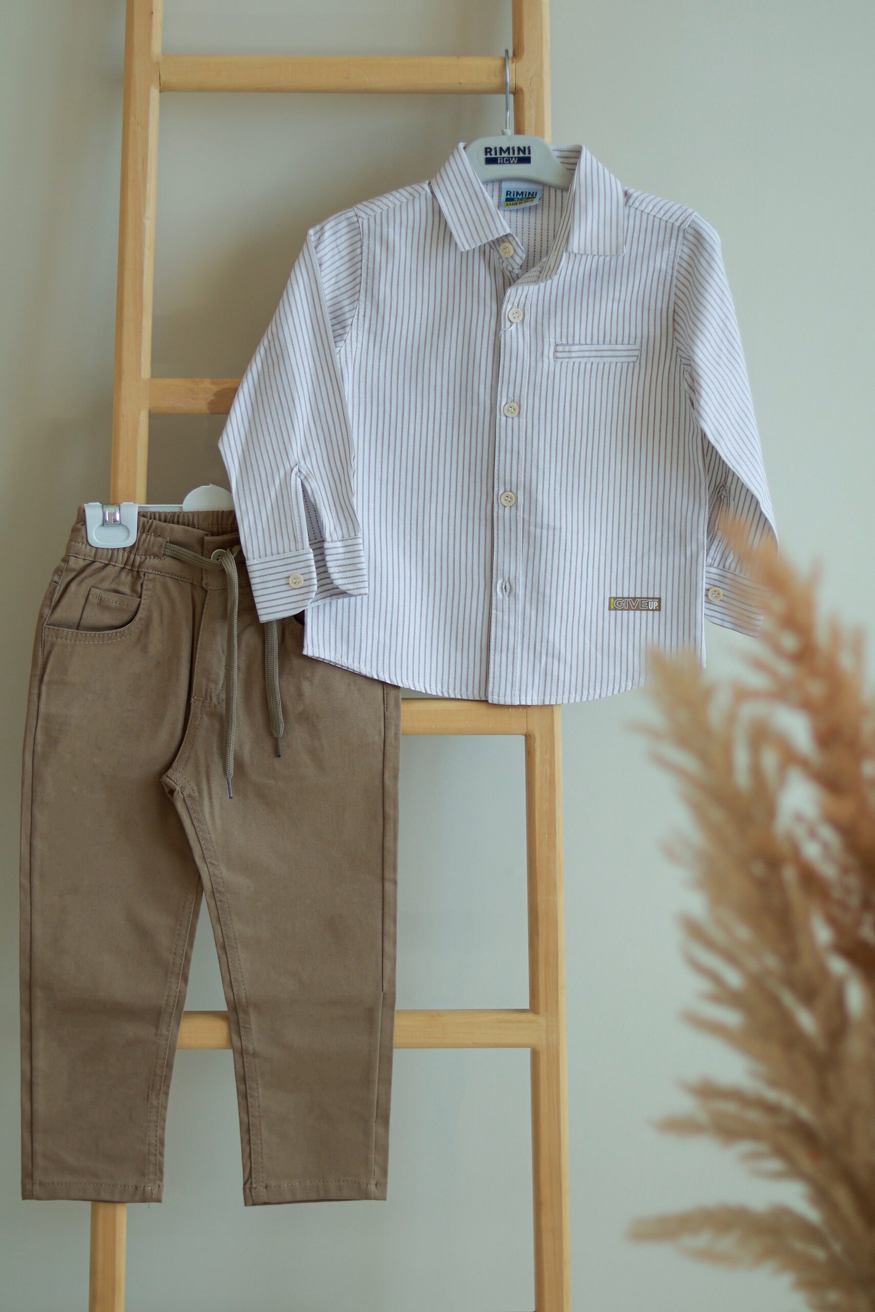 ست دو تیکه پسرانه ریمینی یکی از جذاب ترین و باکیفیت ترین انتخاب ها برای پسر بچه هایی است که به استایل مرتب و شیک علاقه دارند. این ست شامل شومیزی از جنس پارچه لینن و شلواری از جنس کتان مرغوب است که ترکیب آن ظاهری خاص و آراسته به کودک می بخشد. پارچه لینن به دلیل خنک بودن و لطافت بالا برای فصول گرم سال بسیار مناسب است و در عین حال بافت مقاوم آن دوام بالایی دارد.