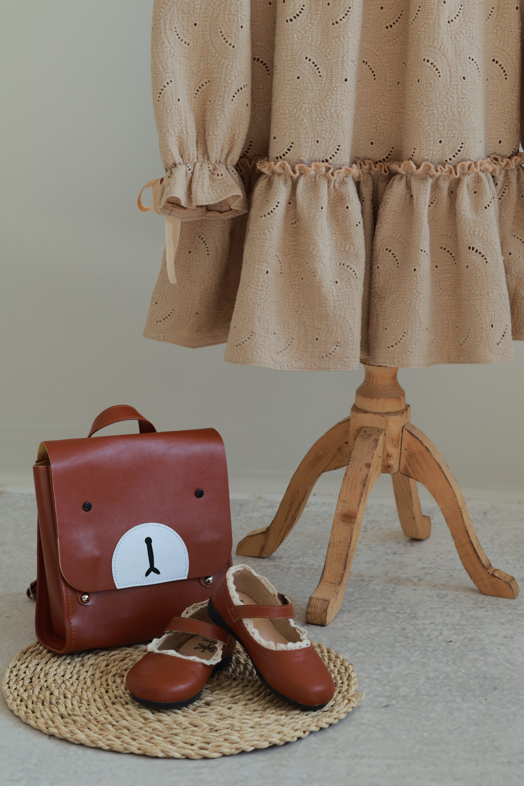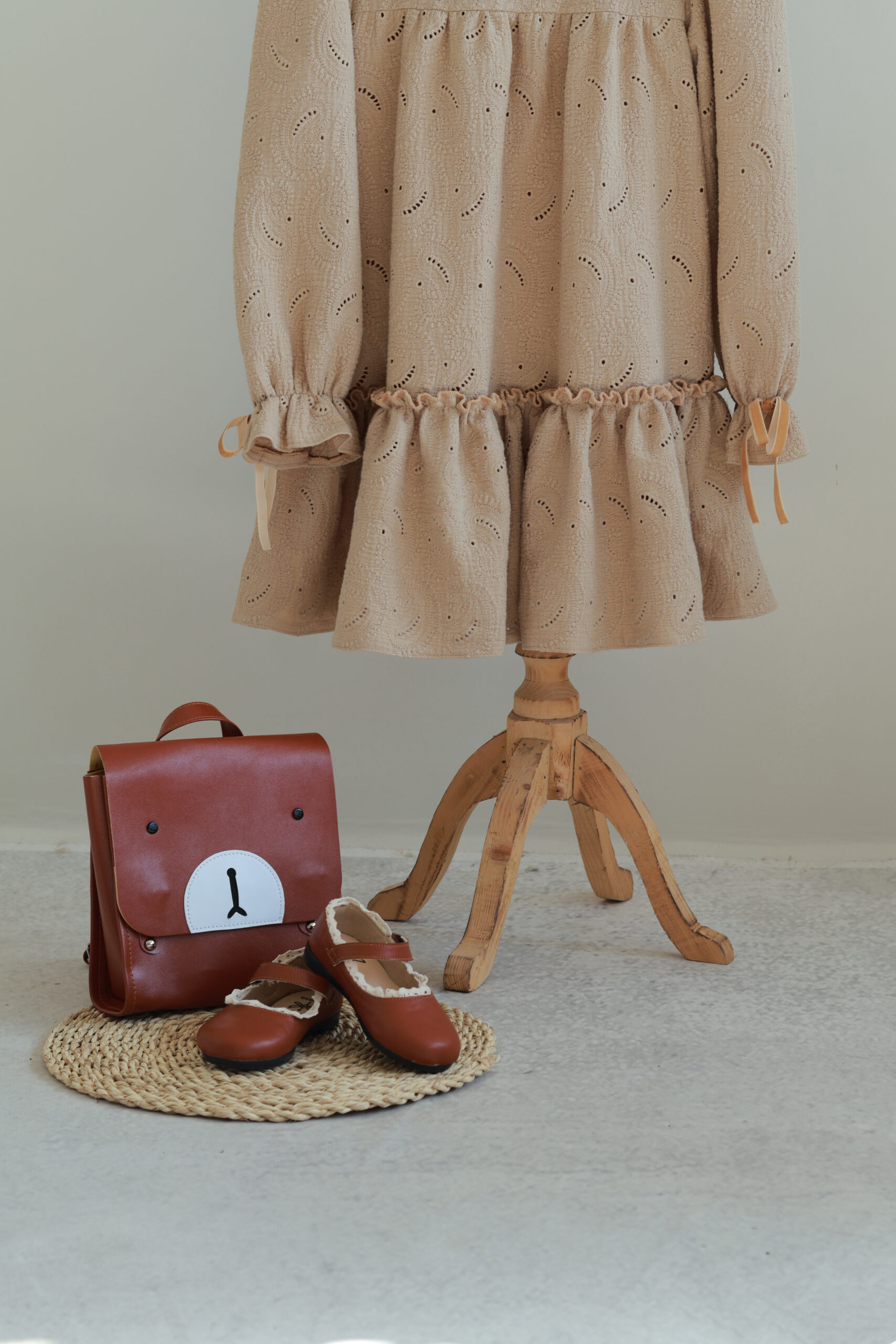 جنس پیراهن از پارچه موسلین با بافت سبک و نرم می‌باشد که حرکت راحت و تنفس پوست را فراهم می‌کند. تمامی قسمت‌های پیراهن آسترکشی شده تا راحتی کامل و پوشش مناسب برای کودک فراهم شود. پشت پیراهن با زیپ بسته می‌شود تا فرم لباس تمیز و مرتب باقی بماند. دوخت دقیق در قسمت سرشانه و کمر باعث می‌شود لباس روی بدن کودک ایست مناسبی داشته باشد و ظاهری مرتب و جذاب ایجاد شود.