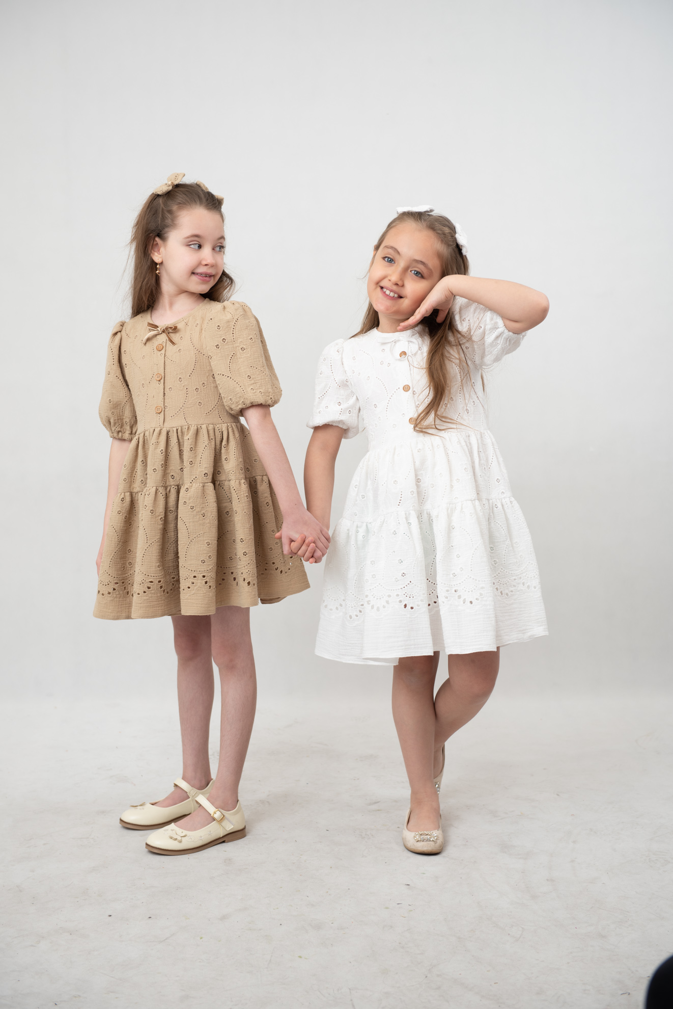 پارچه موسلین نخ دارای بافتی سبک، خنک و بسیار مقاوم است که در تمام فصول سال به خصوص بهار و تابستان، بهترین گزینه برای کودکان می‌باشد. طراحی گلدوزی شده پیراهن، جلوه‌ای خاص و دلنشین به استایل کودک شما می‌بخشد.