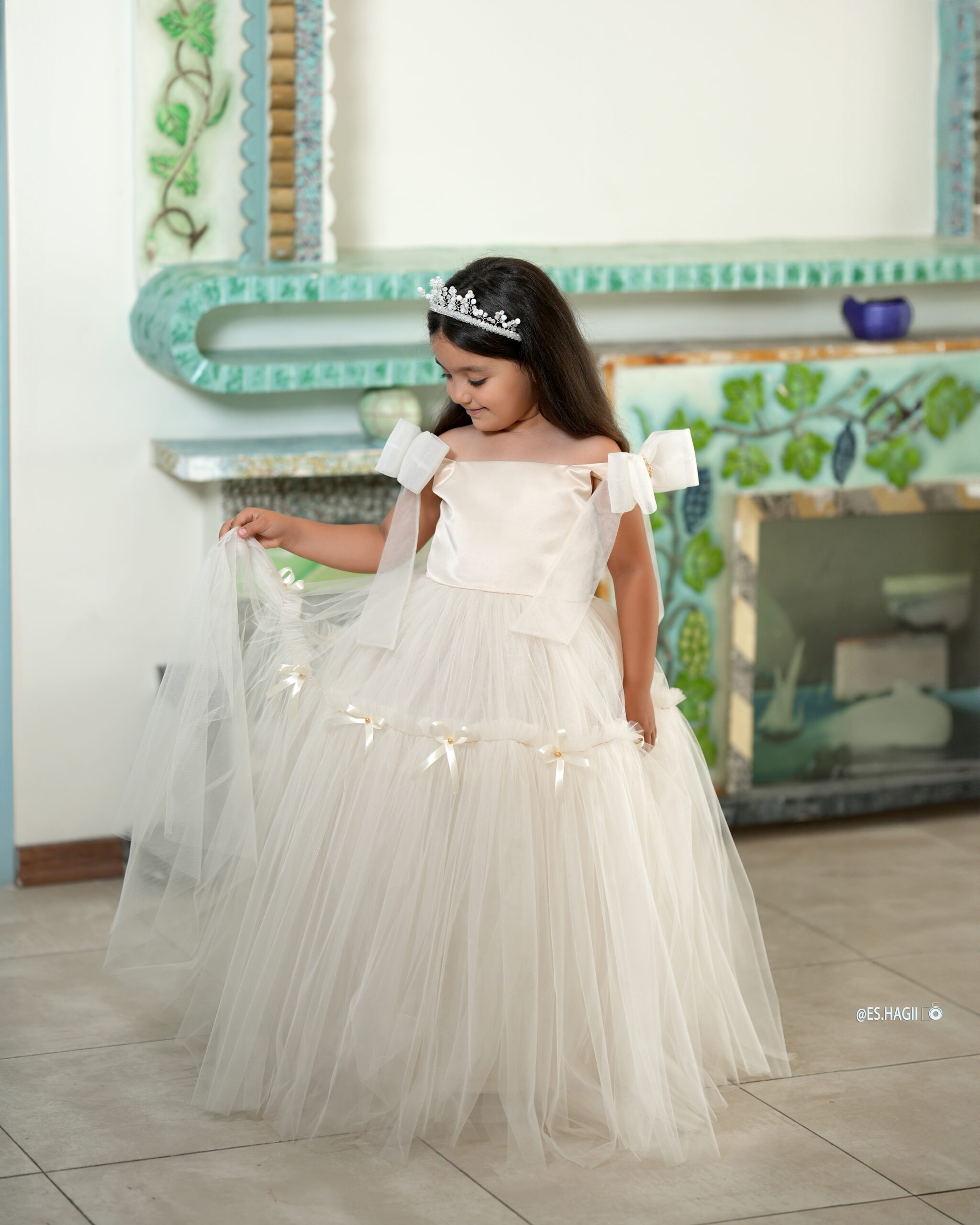دامن چند لایه تور، حجم دلنشینی به لباس داده و نمایی شبیه به لباس های شاهدخت های داستانی ایجاد می کند. ترکیب رنگ های ملایم و پارچه های لوکس، این پیراهن را به مدلی خاص و ماندگار در کمد لباس کودک تبدیل می کند.